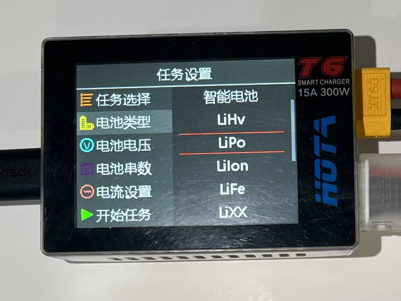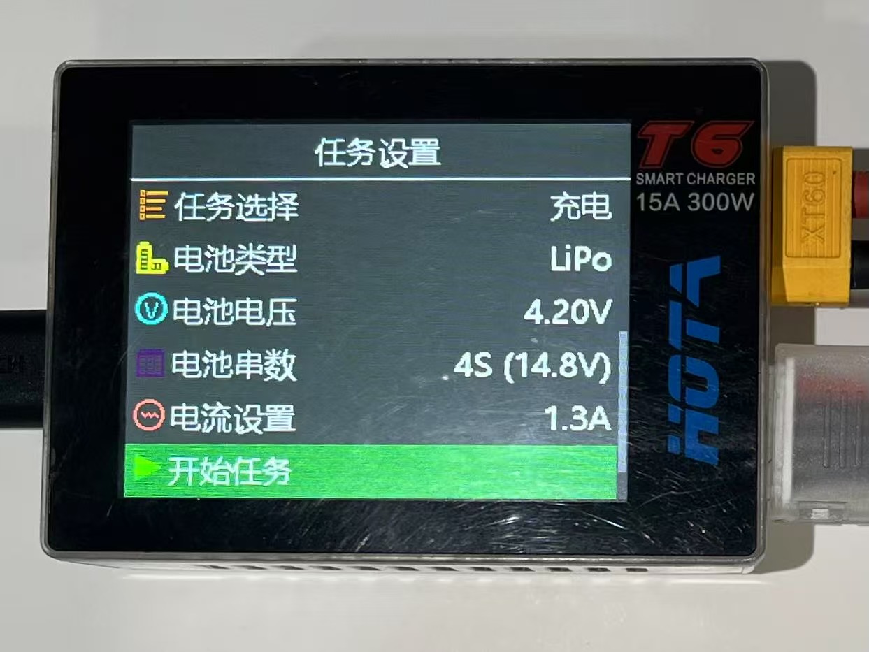 将电池的电源接口和平衡线接入充电器,根据电源类型选择对应的电池。