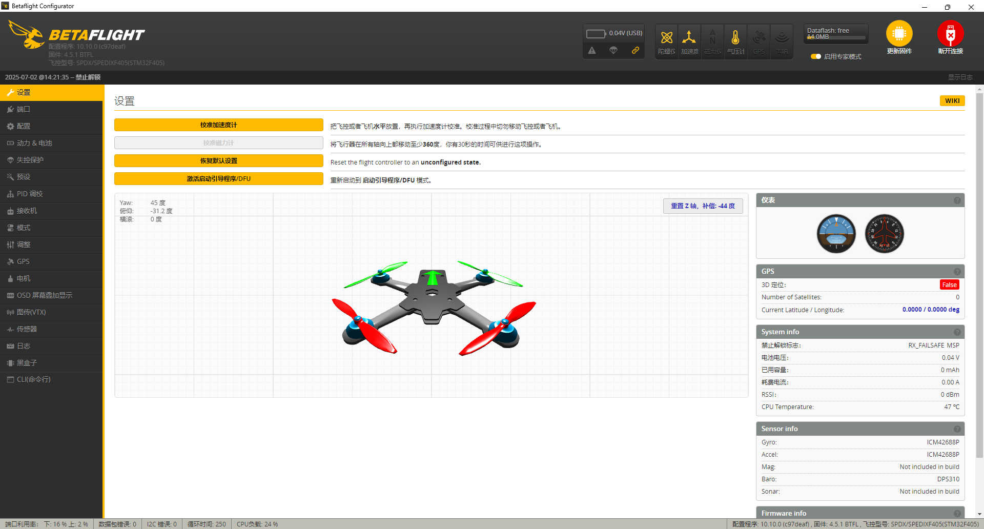 若机头方向不对,在配置界面重新调整机头位置。若在地面站轴始终无法正确显示,则检查飞控板陀螺仪上方是否有线缆经过。如果有,请重新布线,不要让线缆经过陀螺仪。如果始终无法解决,则大概率陀螺仪损坏。