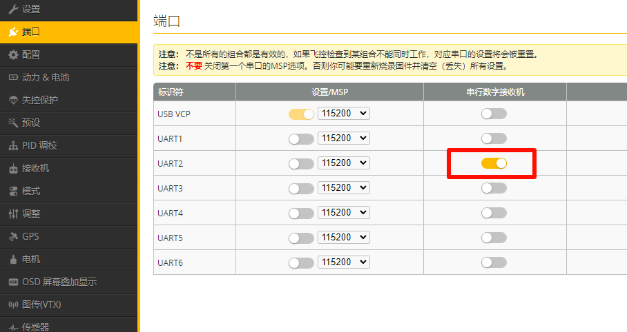 端口页面,确保接收机的UART端口已经打开接收机,图传等外设对应的端口,用遥控器对频接收机。