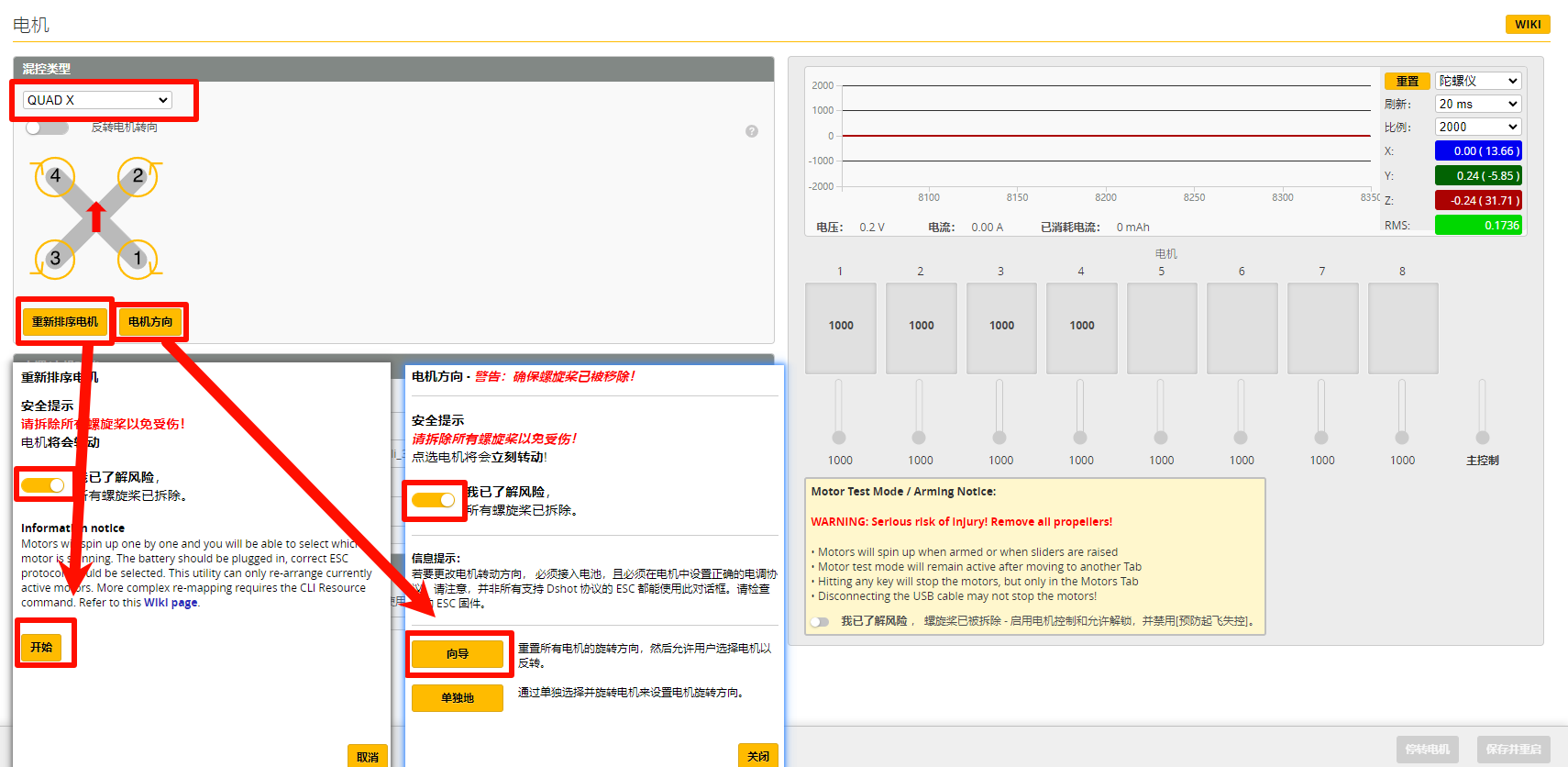 第一次调试请先调整电机顺序,然后设置电机转向,电机转向选择向导,按照图示设置。