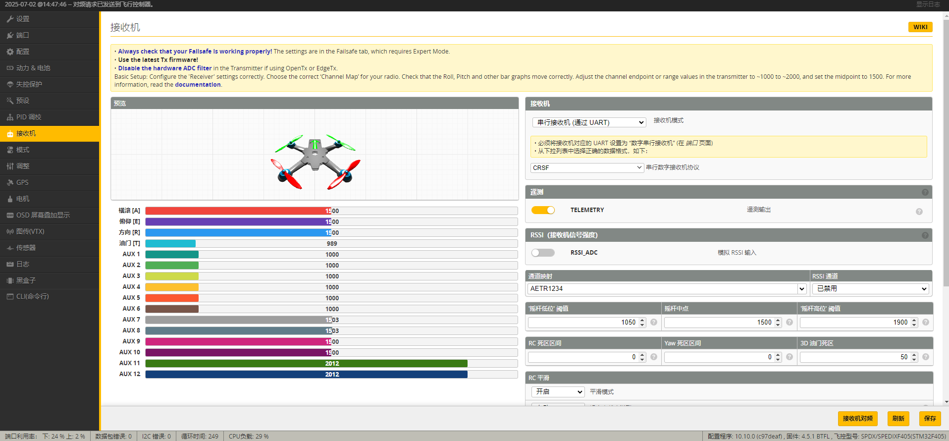 接收机页面确保各通道正常。遥控打杆,查看示意模型的是否正确。
