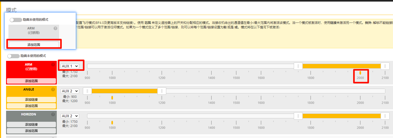 点击 添加范围 后,遥控打对应的通道,地面站会自动识别,如果打错了,点击下拉菜单 AUX ? 重新调回 自动 重复操作。
